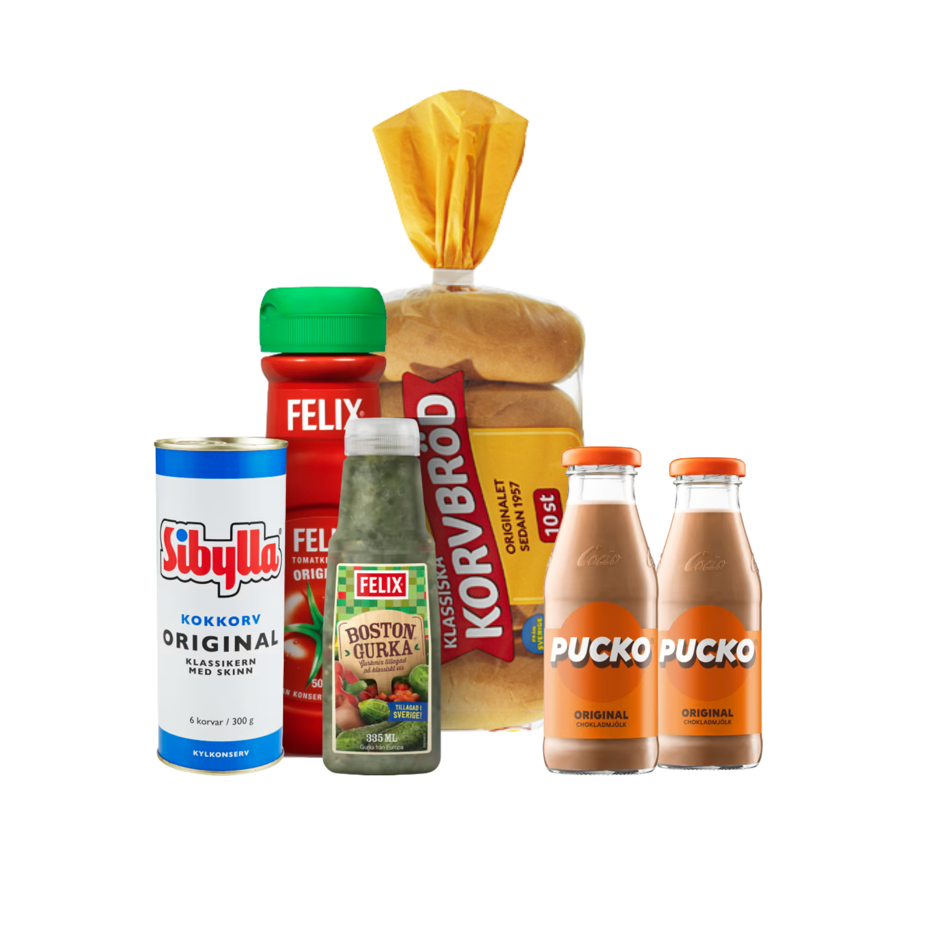 Enjoy juicy Sibylla korv, soft korvbröd, tangy Felix ketchup and Boston gurka, topped with crispy rostad lök — and don’t forget two cold Pucko chocolate milks to complete the experience.