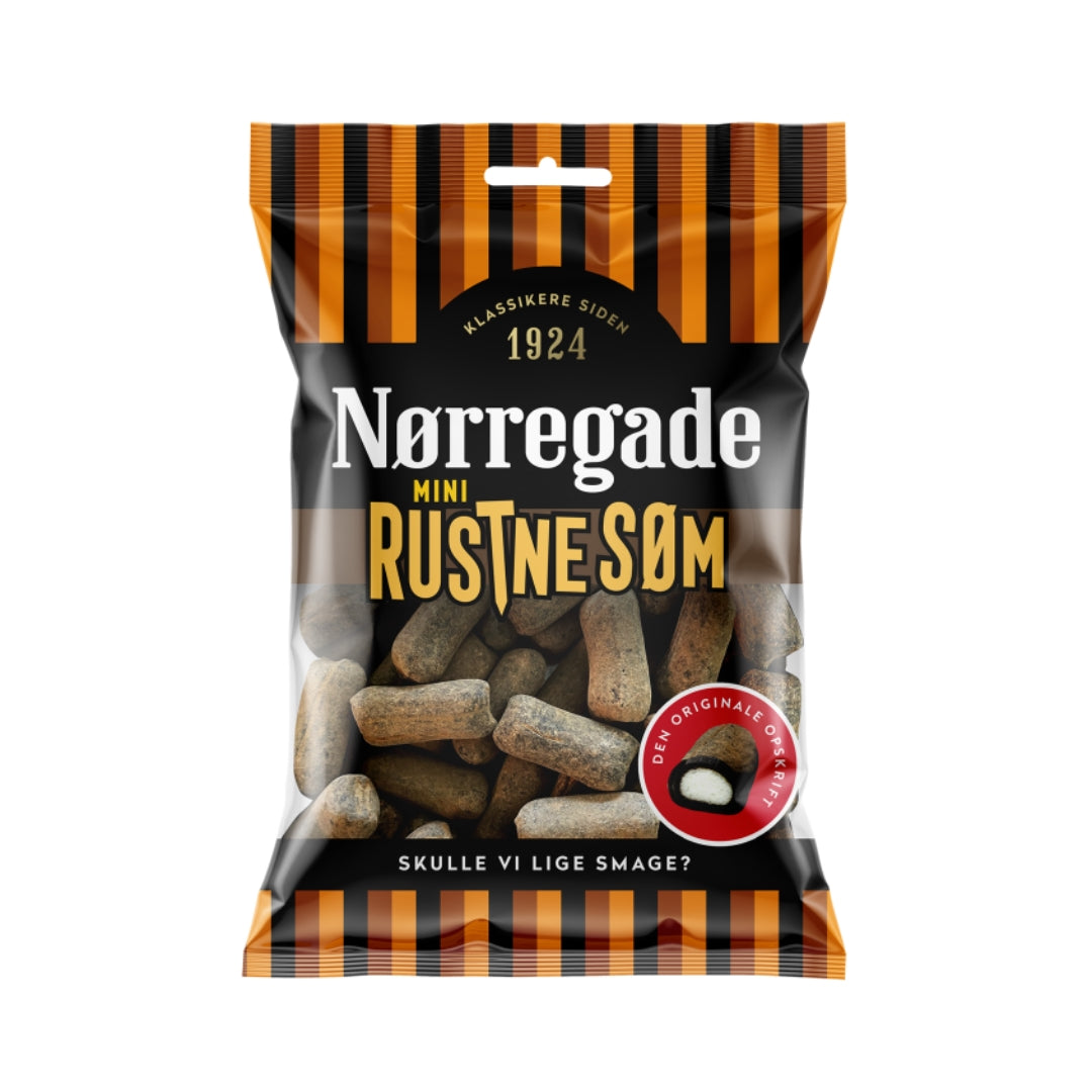 Discover a bold and classic Danish licorice candy with Nørregade Rystne Søm — hard boiled candies with a white core and generously dusted with licorice powder. Each piece delivers a firm bite and a powerful burst of salty-sweet licorice flavor that lingers.